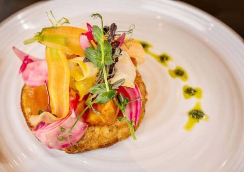 | Roasted eggplant Roasted eggplant pavé, mozzarella di Burrata with fleur de sel and green olive oil, served with a basil coulis and a few redcurrants. |